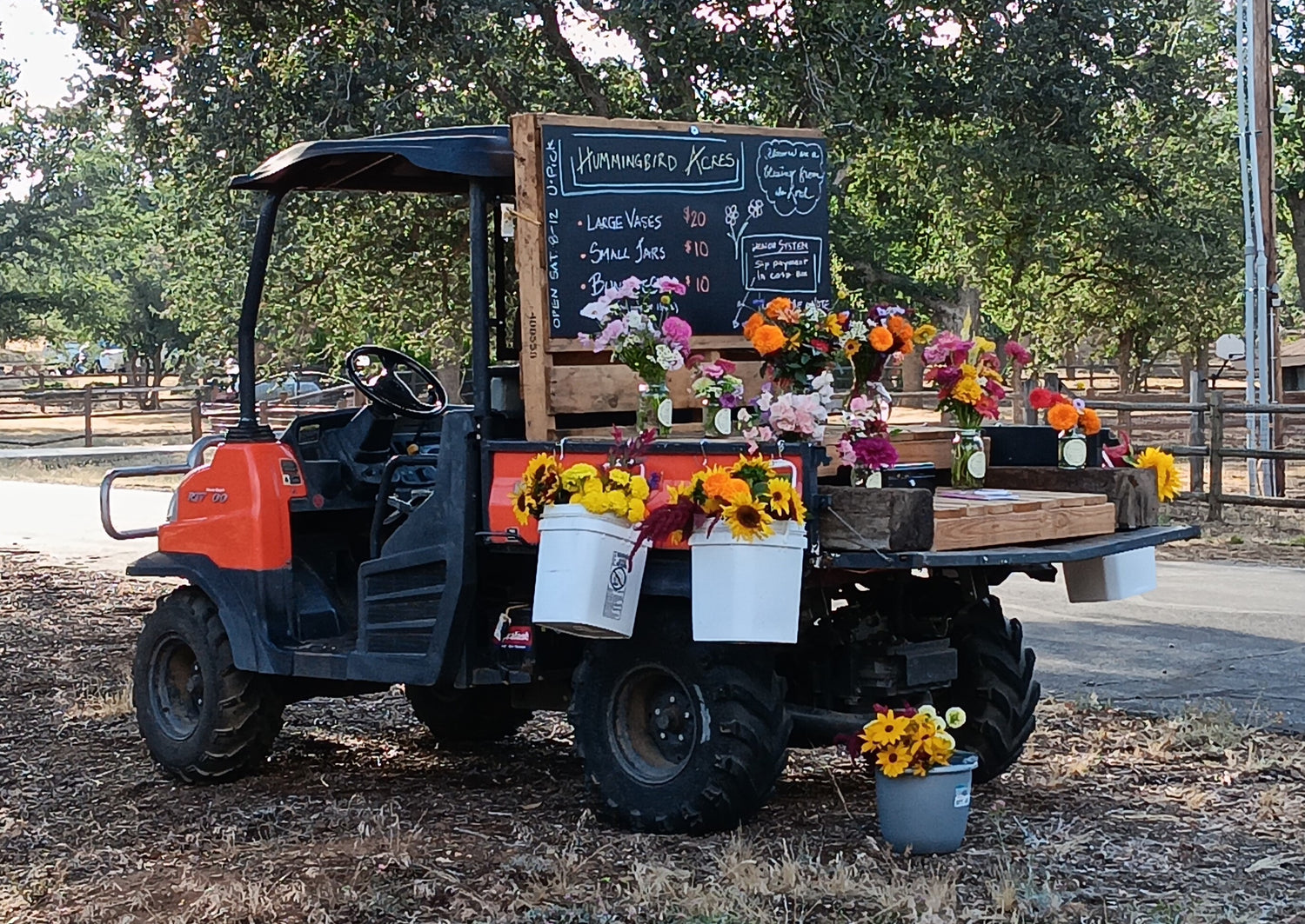 Hank our side-by-side cart will be parked in front of the Flower Farm, brimming with bouquets for purchase.